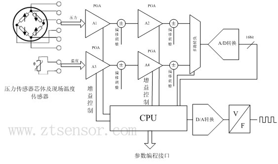 在敏感元件封裝,穩定性處理后,必須對傳感器在數字域對零點偏移、非線性、靈敏度、溫度進行補償才能達到0.01%的高精度要求。如圖是數字校正原理圖,壓力信號和溫度信號經過放大,偏移調整,通過多路轉換開關輸入到A/D轉換端口,轉換后的數字信號被CPU通過校正算法校正,CPU將校正后的16位數字信號送到D/A轉換器,最終以電流或電壓的形式輸出,或直接以頻率信號輸出。