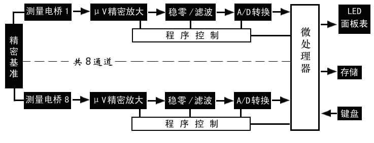 智能應(yīng)變測量儀由應(yīng)變電橋、放大器、信號調(diào)理電路、微處理器、顯示記錄器等基本部分組成。