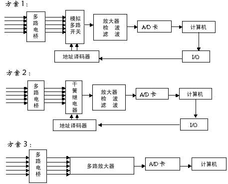 從三種方案的結(jié)構(gòu)框圖我們很明顯的看出他們的區(qū)別。分析方案(1):它的主要優(yōu)點(diǎn)是多路信號共用一路放大模塊成本低,但它的不足之處在于它需要反向控制,也就是它需要一塊I/O卡,尤其關(guān)鍵的一點(diǎn)是在這個系統(tǒng)中從電橋輸出的信號特別微弱,而模擬開關(guān)切換的信號很容易將該微弱信號淹沒。