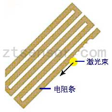 通過薄膜補(bǔ)償電阻網(wǎng)絡(luò)的組合,可以將傳感器的零點(diǎn)控制在±2000μV范圍內(nèi),但傳感器的零點(diǎn)輸出要求滿足±500μV要求。而且傳感器經(jīng)過高低溫、加載疲勞、長期的零點(diǎn)時(shí)漂后,還要保證輸出在±500μV內(nèi),這需要在傳感器的裝配、調(diào)試過程中反復(fù)補(bǔ)償。僅通過電阻組合或外并電阻補(bǔ)償,工藝調(diào)試量大,也很難準(zhǔn)確到位。在本項(xiàng)目中,加入了先進(jìn)的激光調(diào)阻工藝,對(duì)電阻條的阻值進(jìn)行修正。激光調(diào)阻示意圖如圖2。