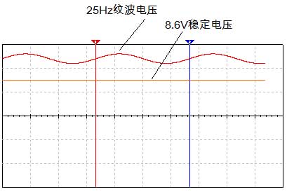 a、Vin輸入條件:電壓12V,Vpp=1V,紋波頻率25Hz。 用示波器測(cè)Vo=8.6V,見(jiàn)圖3。